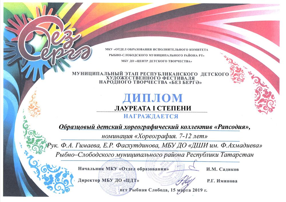 - Хореографический коллектив "Рапсодия" - Диплом Лауреата I степени муниципального этапа Республиканского детского художественного фестиваля народного творчества "Без берге" в номинации "Хореография 7-12 лет"(март 2019г.)