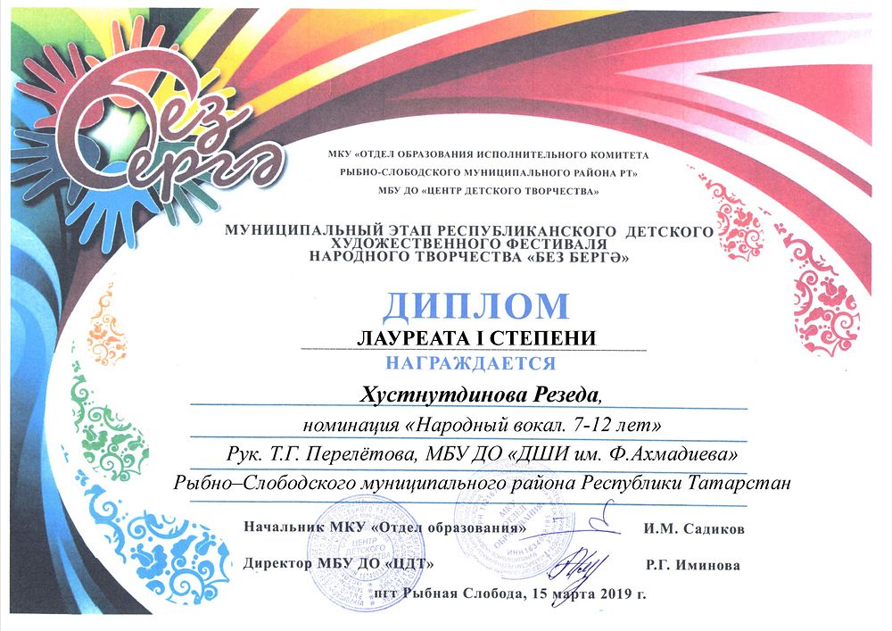- Хуснутдинова Резеда - Диплом Лауреата I степени муниципального этапа Республиканского детского художественного фестиваля народного творчества "Без берге" в номинации "Народный вокал. 7-12 лет"(март 2019г.)