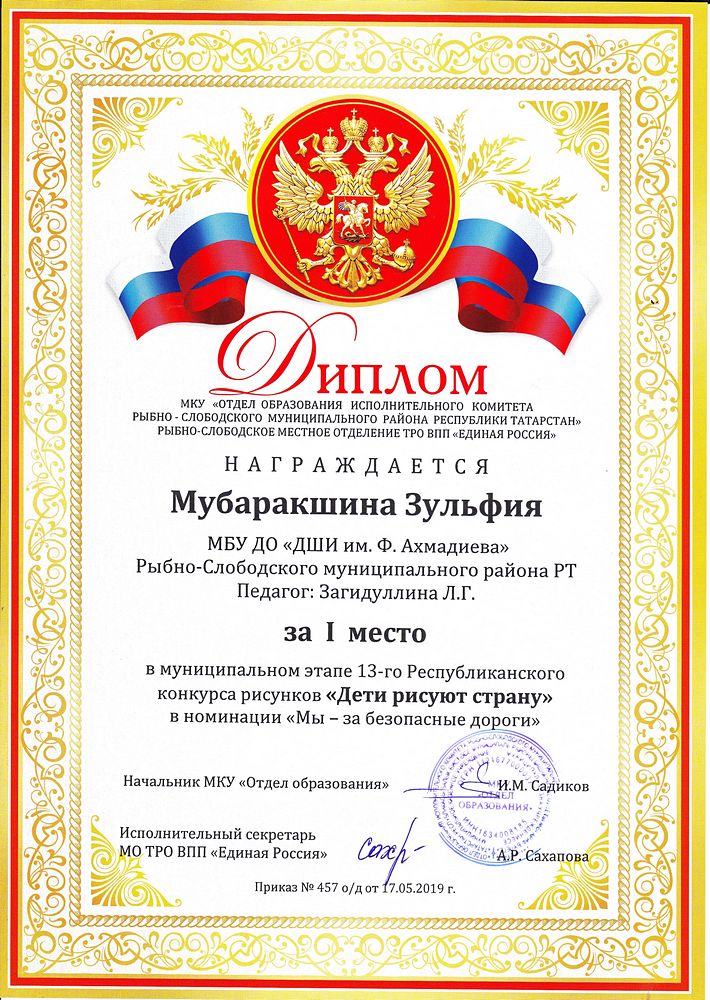 - Мубаракшина Зульфия - Диплом за I место в муниципальном этапе XIII-го Республиканского конкурса рисунков "Дети рисуют страну" в номинации "Мы - за безопасные дороги" (май 2019г.)