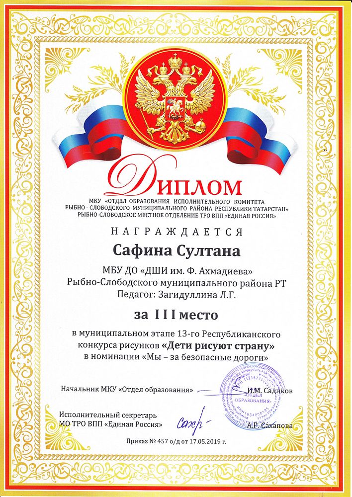 - Сафина Султана - Диплом за III место в муниципальном этапе XIII-го Республиканского конкурса рисунков "Дети рисуют страну" в номинации "Мы - за безопасные дороги" (май 2019г.)