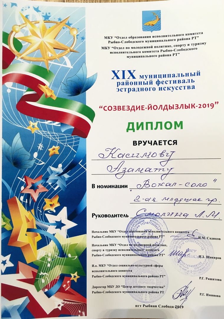 - Касимов Азамат - Диплом участника муниципального этапа Открытого Республиканского телевизионного молодежного фестиваля эстрадного искусства "Созвездие-Йолдызлык" (февраль 2019г.)