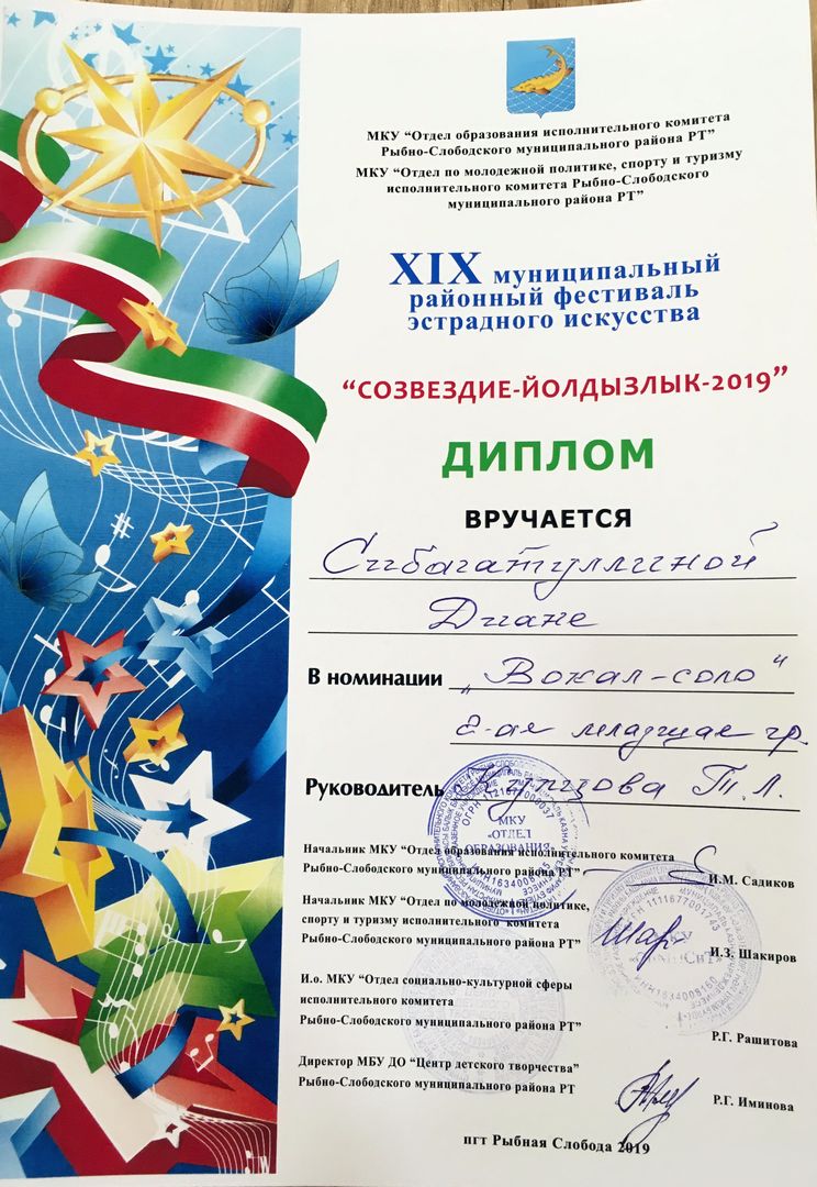 - Сибагатуллина Диана - Диплом участника муниципального этапа Открытого Республиканского телевизионного молодежного фестиваля эстрадного искусства "Созвездие-Йолдызлык" (февраль 2019г.)