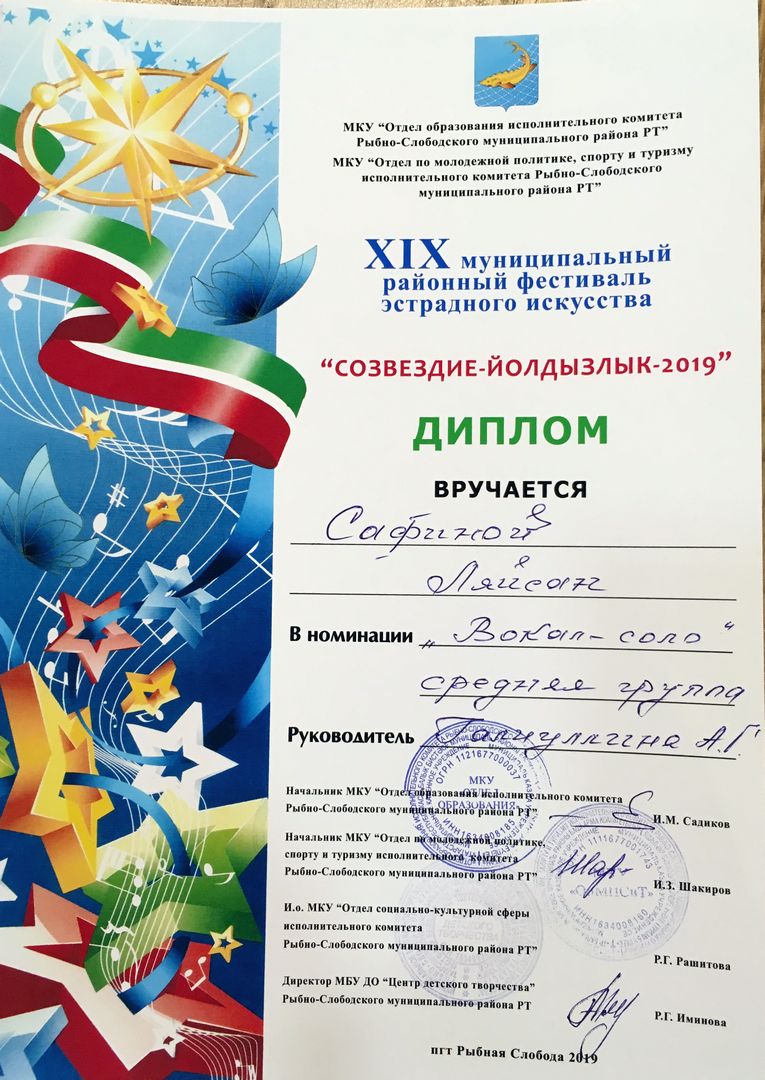 - Сафина Ляйсан - Диплом участника муниципального этапа Открытого Республиканского телевизионного молодежного фестиваля эстрадного искусства "Созвездие-Йолдызлык" (февраль 2019г.)