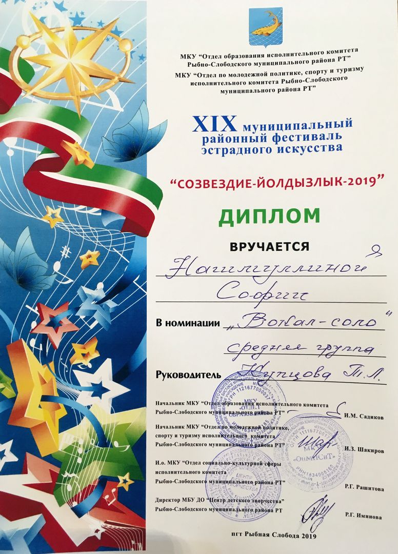 - Нагимуллина София - Диплом участника муниципального этапа Открытого Республиканского телевизионного молодежного фестиваля эстрадного искусства "Созвездие-Йолдызлык" (февраль 2019г.)
