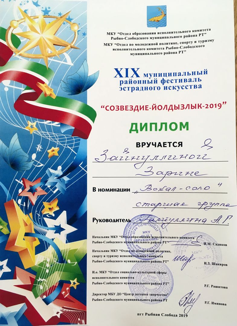 - Зайнуллина Зарина - Диплом участника муниципального этапа Открытого Республиканского телевизионного молодежного фестиваля эстрадного искусства "Созвездие-Йолдызлык" (февраль 2019г.)