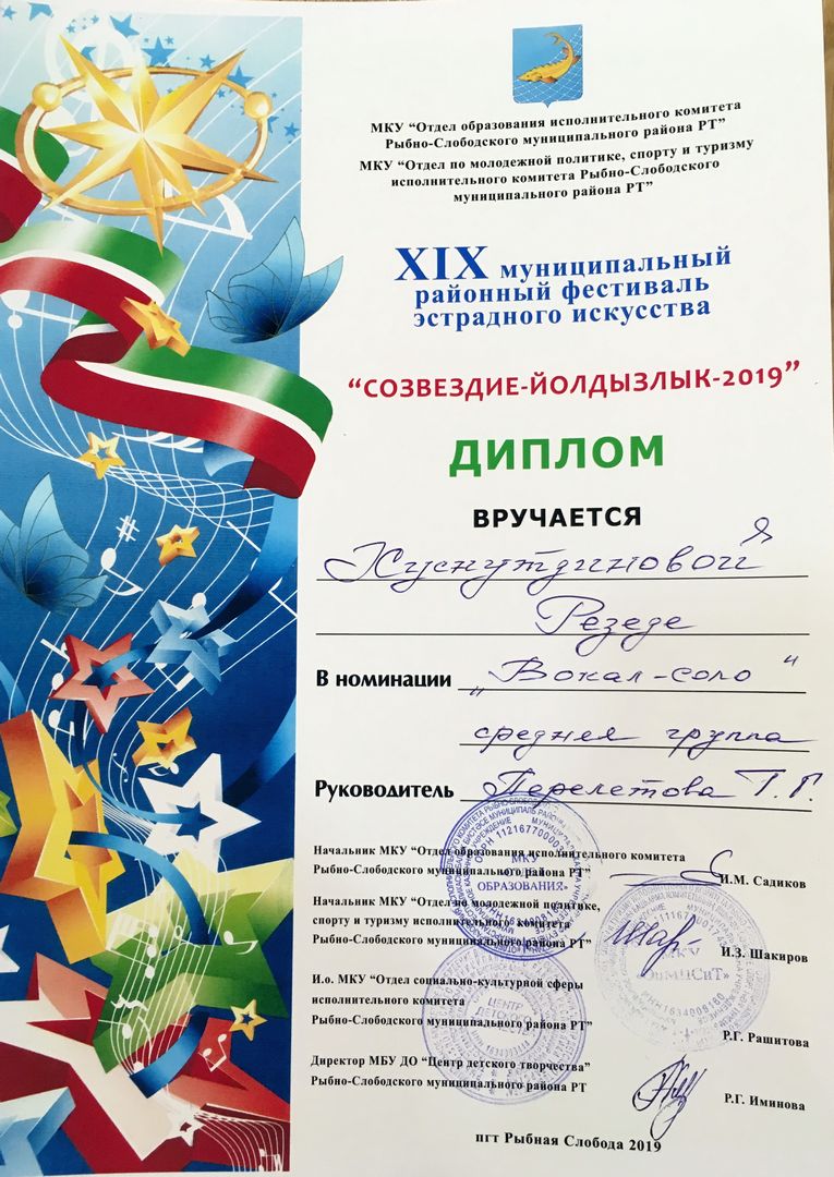 - Хуснутдинова Резеда - Диплом участника муниципального этапа Открытого Республиканского телевизионного молодежного фестиваля эстрадного искусства "Созвездие-Йолдызлык" (февраль 2019г.)