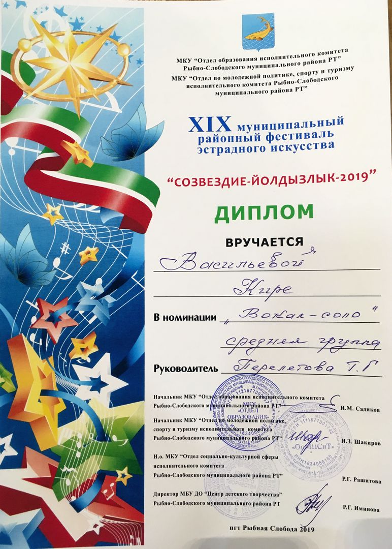- Васильева Кира - Диплом участника муниципального этапа Открытого Республиканского телевизионного молодежного фестиваля эстрадного искусства "Созвездие-Йолдызлык" (февраль 2019г.)