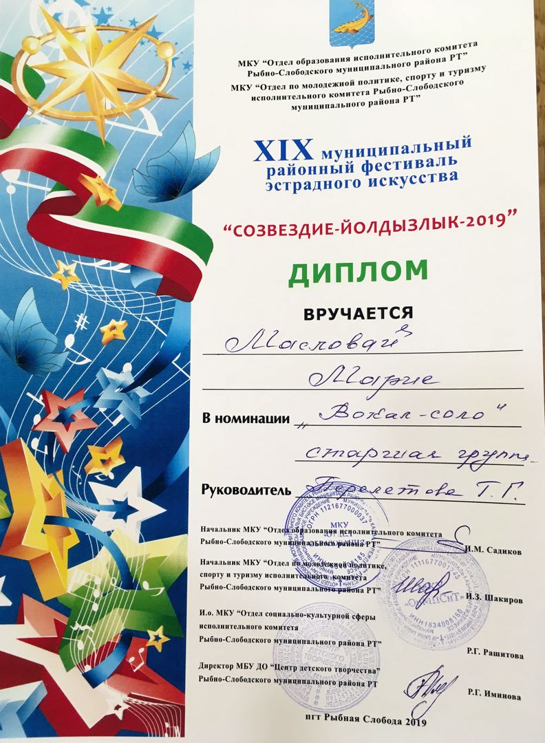 - Маслова Мария - Диплом участника муниципального этапа Открытого Республиканского телевизионного молодежного фестиваля эстрадного искусства "Созвездие-Йолдызлык" (февраль 2019г.)