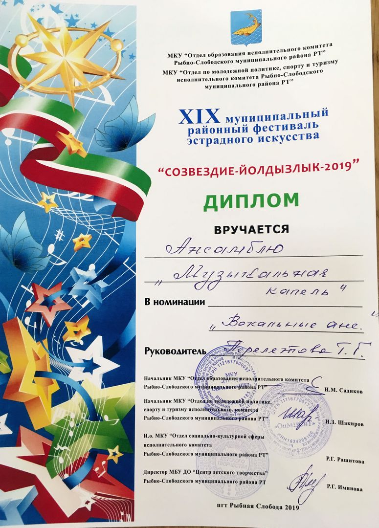 - Ансамбль "Музыкальная капель" - Диплом участника муниципального этапа Открытого Республиканского телевизионного молодежного фестиваля эстрадного искусства "Созвездие-Йолдызлык" (февраль 2019г.)