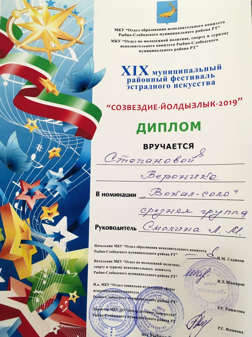 - Степанова Вероника - Диплом участника муниципального этапа Открытого Республиканского телевизионного молодежного фестиваля эстрадного искусства "Созвездие-Йолдызлык" (февраль 2019г.)