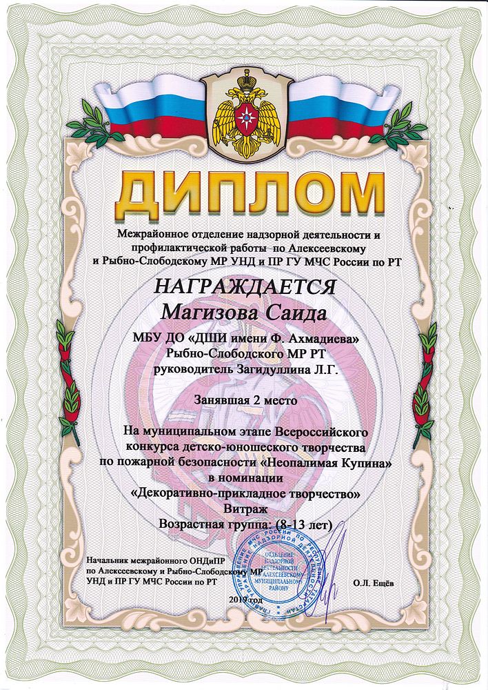 - Магизова Саида - Диплом за II место в муниципальном этапе Всероссийского конкурса детско-юношеского творчества по пожарной безопасности "Неопалимая Купина" в номинации "ДПИ. 8-13 лет"