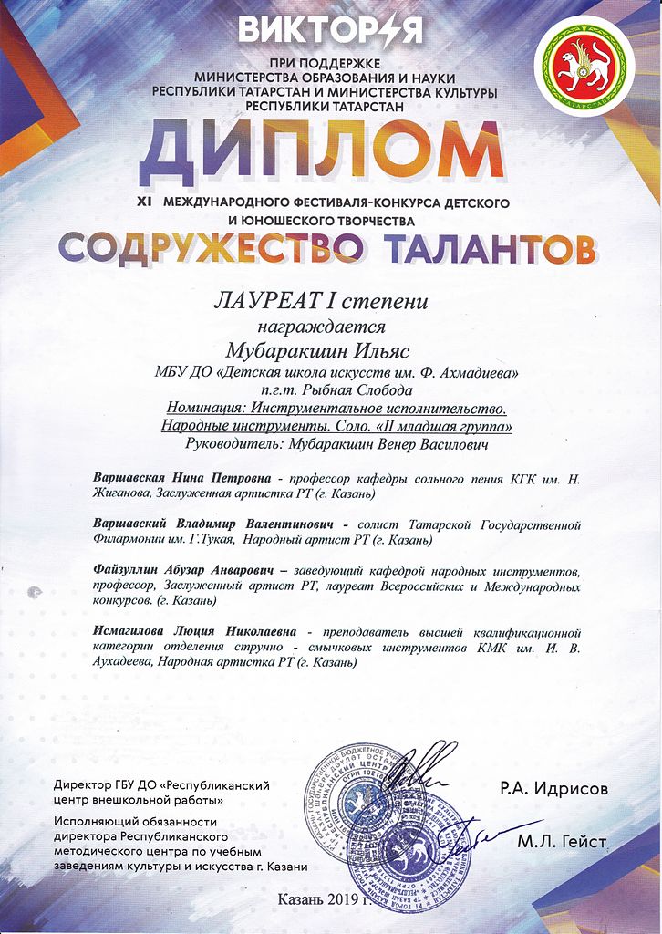 - Мубаракшин Ильяс - Лауреат I-й степени XI-го Международного фестиваля-конкурса детского и юношеского творчества "Содружество талантов" в номинации "Инструментальное исполнительство. Народные инструменты. Соло. 2-я младшая группа" (ноябрь 2019г.)