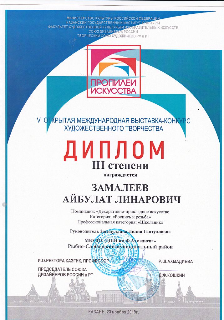 - Замалеев Айбулат - Диплом III-й степени V-й открытой Международной выставки-конкурса художественного творчества "Пропилеи искусства" в номинации "ДПИ.Роспись и резьба" (ноябрь 2019г.)