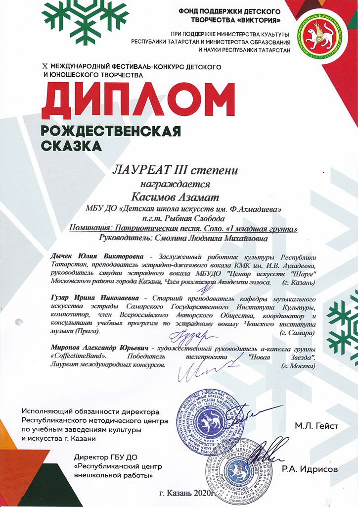 - Касимов Азамат - Диплом Лауреата III-й степени X Международного фестиваля-конкурса детского и юношеского творчества "Рождественская сказка" в номинации "Эстрадный вокал. Соло. 1 младшая группа" (январь 2020г.)