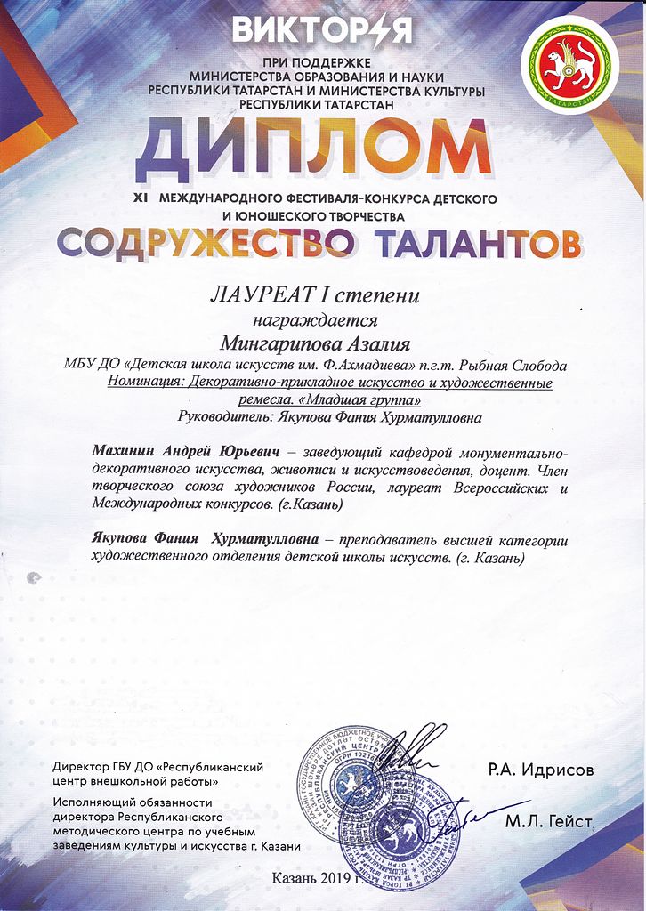 - Мингарипова Азалия - Лауреат I-й степени XI-го Международного фестиваля-конкурса детского и юношеского творчества "Содружество талантов" в номинации "ДПИ и художественные ремесла. Младшая группа" (ноябрь 2019г.)