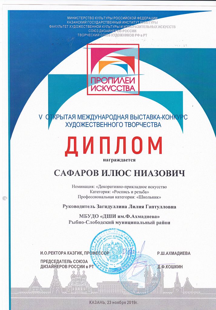 - Сафаров Илюс - Диплом участника V-й открытой Международной выставки-конкурса художественного творчества "Пропилеи искусства" в номинации "ДПИ.Роспись и резьба" (ноябрь 2019г.)