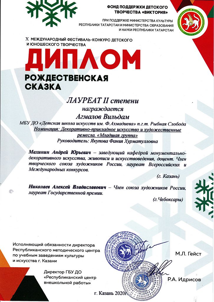 - Агмалов Вильдан - Диплом Лауреата II-й степени X Международного фестиваля-конкурса детского и юношеского творчества "Рождественская сказка" в номинации "ДПИ и художественные ремесла. Младшая группа" (январь 2020г.)