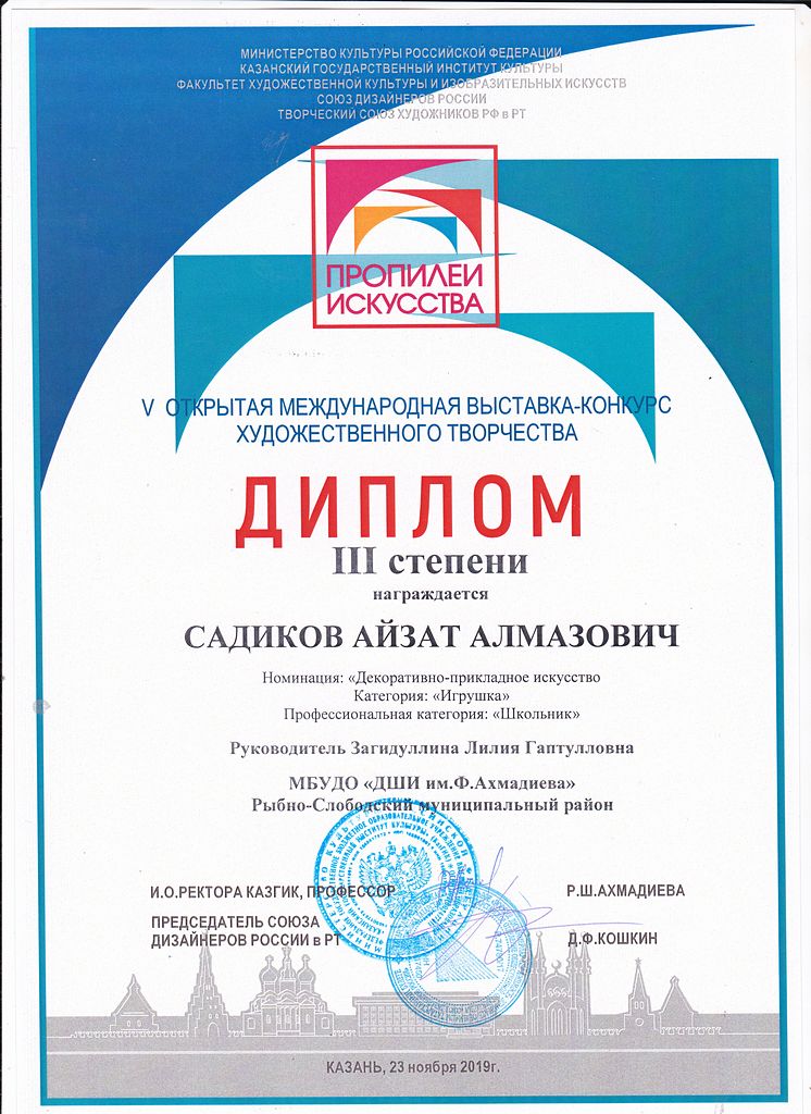 - Садиков Айзат - Диплом III-й степени V-й открытой Международной выставки-конкурса художественного творчества "Пропилеи искусства" в номинации "ДПИ. Игрушка" (ноябрь 2019г.)