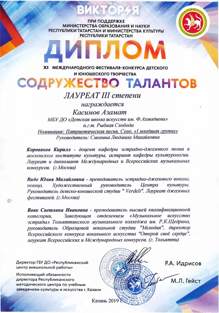- Касимов Азамат - Лауреат III-й степени XI-го Международного фестиваля-конкурса детского и юношеского творчества "Содружество талантов" в номинации "Патриотическая песня. Соло. Младшая группа" (ноябрь 2019г.)