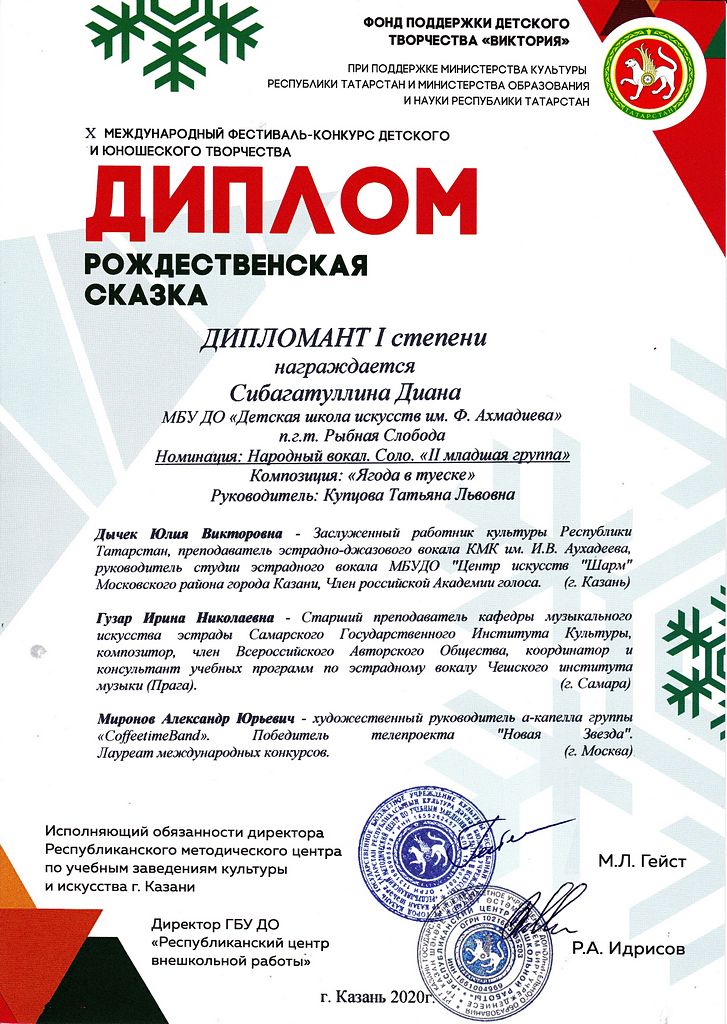 - Сибагатуллина Диана - Диплом Лауреата I-й степени X Международного фестиваля-конкурса детского и юношеского творчества "Рождественская сказка" в номинации "Народный вокал" (январь 2020г.)