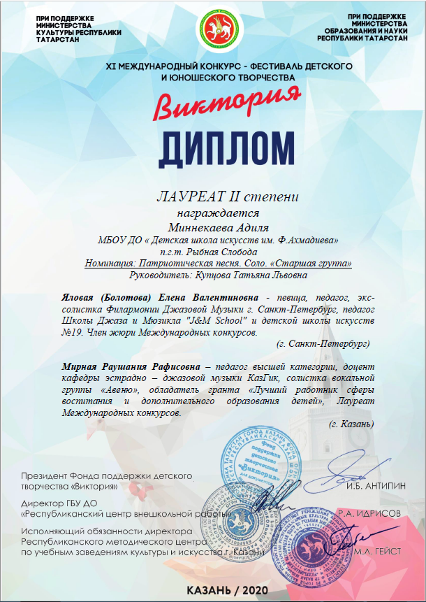 - Миннекаева Адиля - Диплом Лауреата II-й степени XI-го Международного конкурса-фестиваля детского и юношеского творчества "Виктория" (май 2020г.)