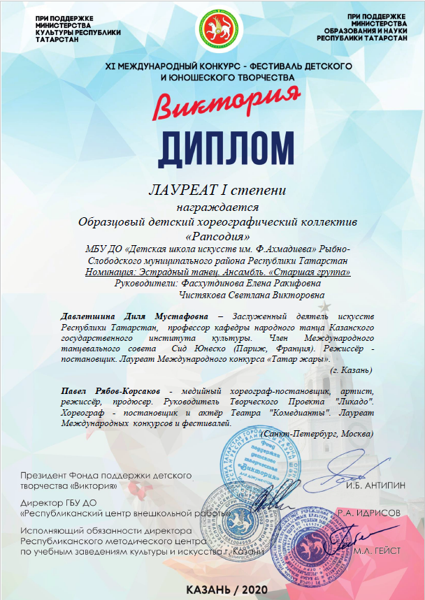 - Образцовый детский хореографический коллектив "Рапсодия" - Диплом Лауреата I-й степени XI-го Международного конкурса-фестиваля детского и юношеского творчества "Виктория" (май 2020г.)