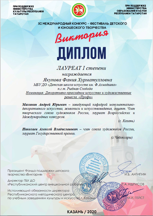 - Якупова Фания - Диплом Лауреата I-й степени XI-го Международного конкурса-фестиваля детского и юношеского творчества "Виктория" (май 2020г.)