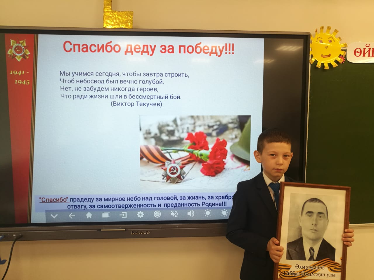 «Минем бабам-каһарман» акциясе дәвам итә. Һәр көн без Бөек Ватан сугышында катнашкан каһарманнарыбызны искә алабыз. 2И сыйныфы укучылары «Җиңү һәркемнең йөрәгендә!» лэп-бугын әзерләделәр.