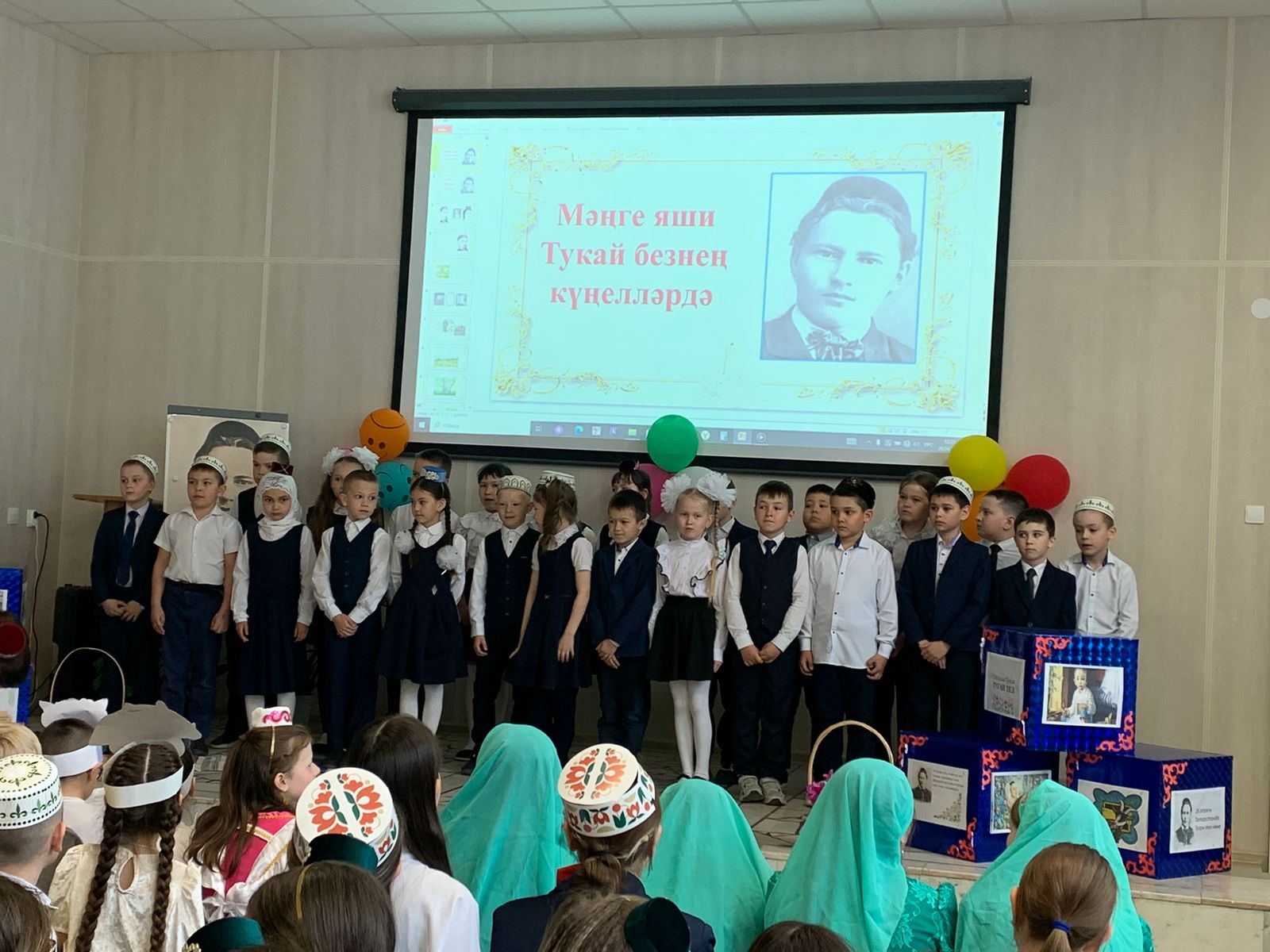 Дәресләрдән соң актлар залында «Мәңге яши Тукай безнең күңелләрдә» исемле концерт булды. Г.Тукайның шигырьләрен сөйләделәр, әкиятләрен сәхнәләштереп күрсәттеләр, җырлар җырладылар.