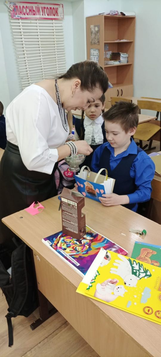 Ученики вместе с классным руководителем Сагировой А. И сделали сумочку добра. Положили в сумку пословицы о доброте, сладкие пожелания и подарили работникам гимназии.«Язгы игелек атналыгы» кысаларында 1Б сыйныфы укучылары Сагирова А.И. җитәкчелегендә «Игелек сумкасы» ясадылар. Аңа мәкальләр ябыштырып, эченә конфетлар салып гимназиянең хезмәткәрләренә бүләк иттеләр.