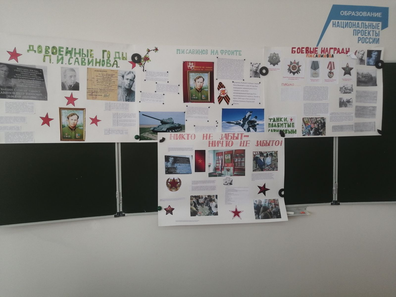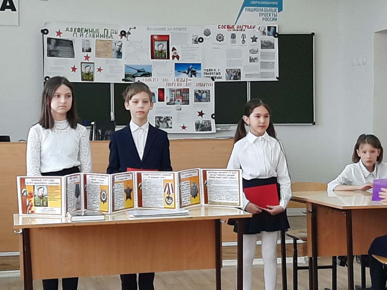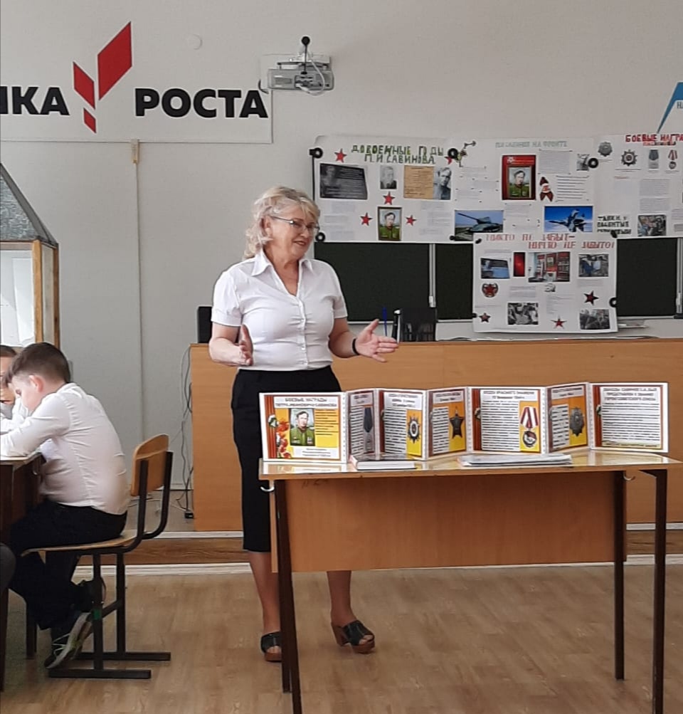 4А сыйныфы укучылары сыйныф җитәкчесе Родионова Е.В. җитәкчелегендә, безнең мәктәпне тәмамлап киткән, танкист Савинов Петр Ивановичка багышланган проектлар якладылар. Балалар районыбызның атаклы шәхесе турында бай эчтәлекле материал җыйганнар. Алар Петр Ивановичның тормышы, аның батырларча үлеме турында группалап сөйләделәр. Бу кеше турында хәтер мәңгелек! Мәктәп музее җитәкчесе Чеботарева Наталья Николаевна 4А сыйныфы укучылары экскурсияләр үткәрә алулары турында әйтте. Икенче атнадан 9 Майга багышланган экскурсияләр мәктәп музеенда эшли башлый. Проектлар югары бәяләнде.