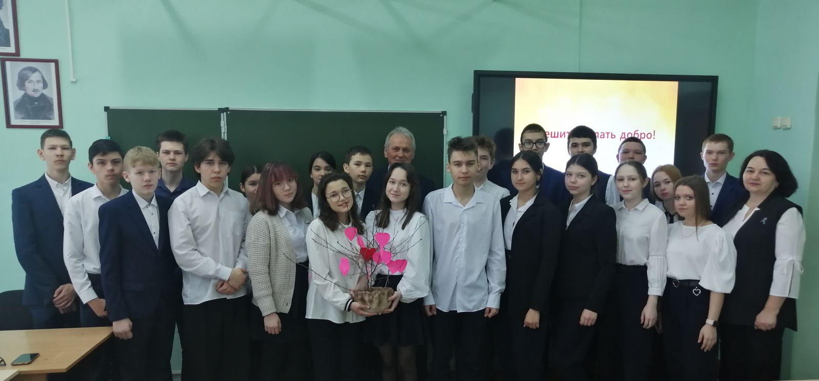 20 апреля в рамках весенней недели Добра в гимназии прошли уроки Доброты. Классный час в 9 Б классе (классный руководитель Кабирова Р.А.) посетил председатель совета ветеранов Рыбно-Слободского района Шавалеев Рафаэль Махмутович. Классный час Рима Адиповна начала с разговора о донорстве, о людях, которые дарят частичку себя другим, спасая тем самым их жизнь. Тема выбрана не случайно. Именно 20 апреля в России отмечается День донора. Тему добра, благотворительности продолжил Шавалеев Р.М. Он привел примеры из собственной жизни о добрых людях, о тех, кто попав в трудную жизненную ситуацию, не сломился и не отчаялся, а выстоял и нашел в себе силы помогать другим, своим примером показывая , что добро всегда возвращается. Рассказ Рафаэля Махмутовича был искренним, идущим от сердца. В конце мероприятия девятиклассники украсили дерево добра сердечками, написав на них понятия, связанные с добром.