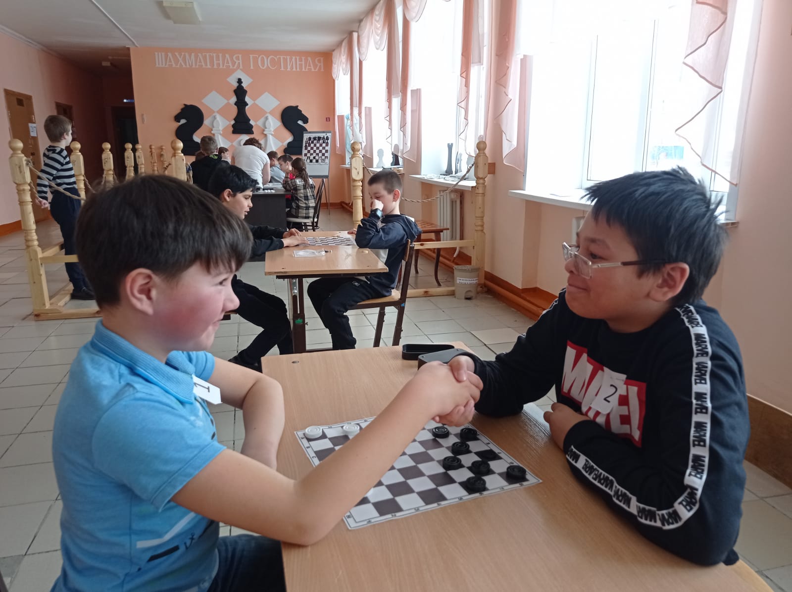 Шашки. Возрастная группа младшего школьного возраста: 1 место - Саймахмедов Ахмад, 2 место - Салахиев Булат, 3 место - Шамсиев Тимур.