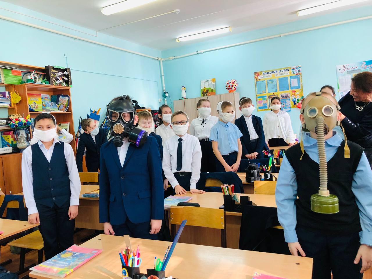 Во время тематических уроков школьникам рассказали об устройстве гражданского противогаза, пояснили, в каких ситуациях его стоит применять, и на какое время противогаз может обезопасить дыхательные пути человека.