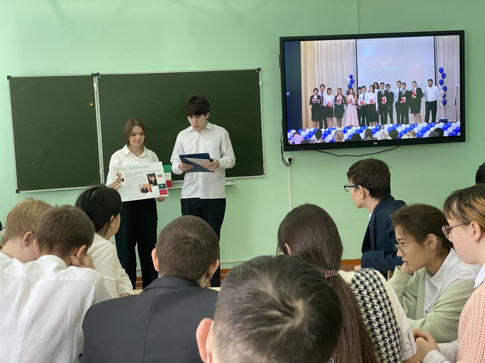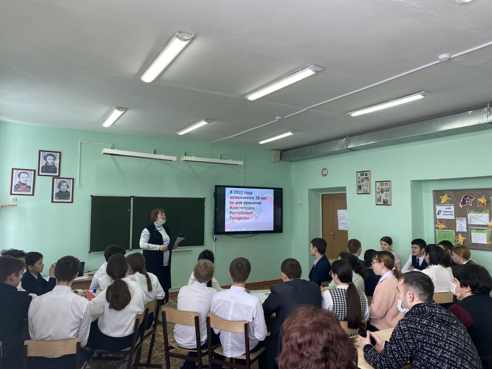 10 февраля в гимназии состоялся парламентский урок, посвященный 30-летию со дня принятия Конституции Республики Татарстан, на тему: «Я – гражданин! Мои права и обязанности». Среди приглашенных гостей были руководитель местной общественной приемной от партии "Единая Россия" Каримуллин Ильшат Ильдусович, а также депутат муниципального образования , член объединения женщин-депутатов "Мэрхэмэт" - "Милосердие" Халимова Л.И. После их приветственного слова учитель истории и обществознания Малямова И.В. с обучающимися 9 Б класса создали листовки-проекты "Я – гражданин! Мои права и обязанности». Ребята получили много новой и интересной информации.