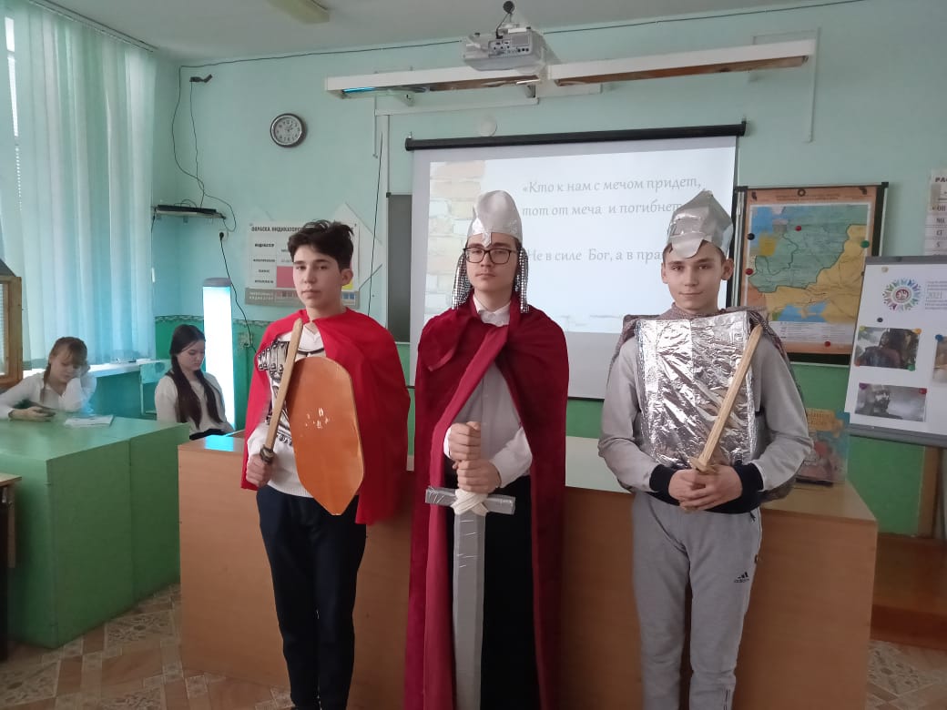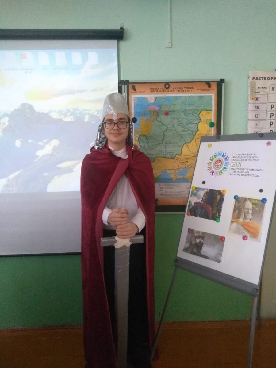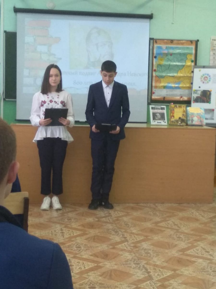 26 января учащиеся 8-х классов в рамках интегрированной Недели литературы и истории представили историко-литературную композицию "Александр Невский - имя России", посвященную Году родных языков и народного единства.В 2021 году отмечается 800 лет со дня рождения этого известного полководца. С интересом учащиеся выслушали рассказ о жизни Александра Невского,посмотрели фрагмент фильма "Александр Невский" режиссера Сергея Эйзенштейна, навсегда запомнили известные слова героя: "Кто к нам с мечом придет, тот от меча и погибнет","Не в силе Бог, а в правде!"Александр Невский-Россия исеме. 26 нчы гыйнвар көнне 8 нче сыйныф укучылары, интеграцияләнгән әдәбият һәм тарих атналыгы кысаларында, Туган телләр һәм Халыклар бердәмлеге елына багышланган "Александр Невский-Россия исеме" исемле тарихи - әдәби композиция тәкъдим иттеләр.2021 елда бу танылган полководецның тууына 800 ел тула. Укучылар Александр Невский тормышы турында кызыксынып тыңладылар, режиссер Сергей Эйзенштейнның "Александр Невский" фильмы фрагментын карадылар, геройның "кем безгә хыял белән килә, ул хыялдан үлә","Алла көчендә түгел, ә хакыйкатьтә!"