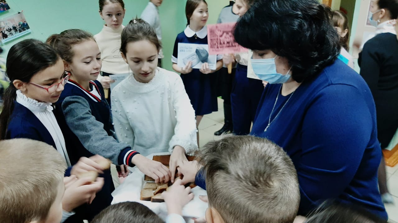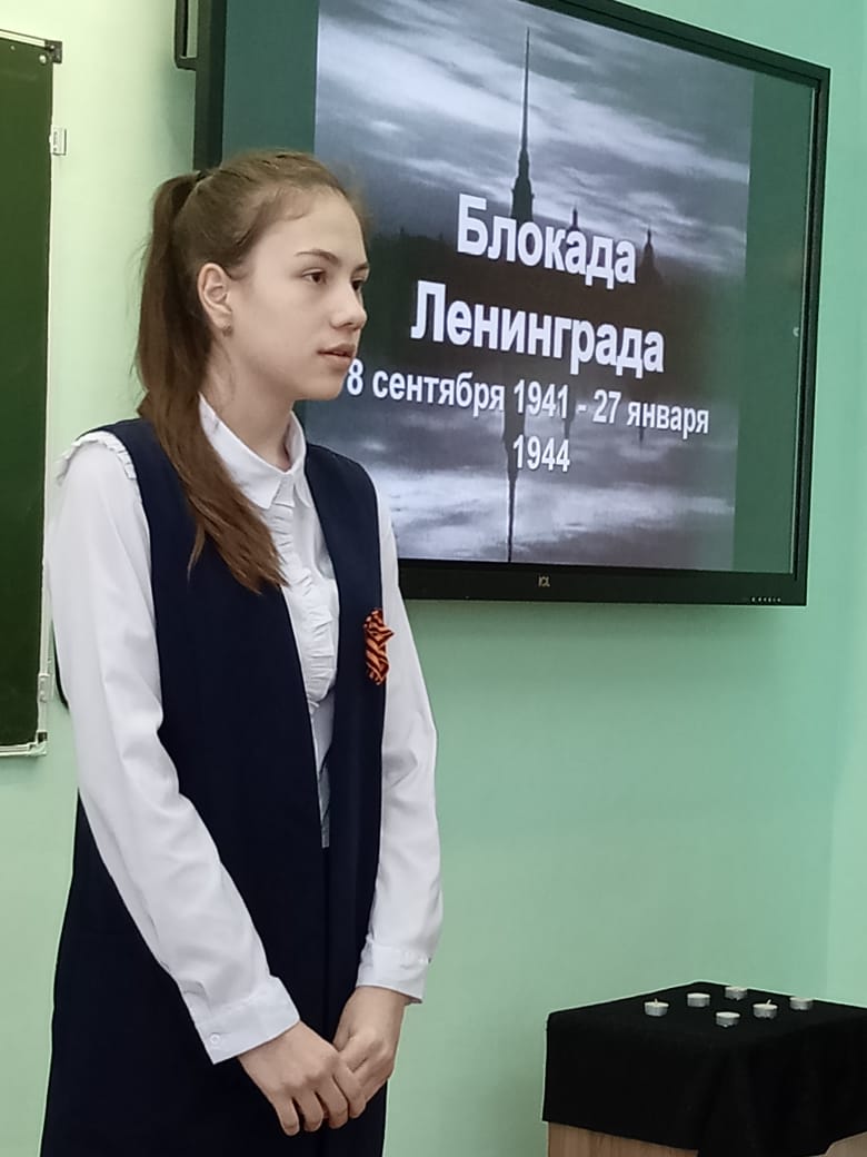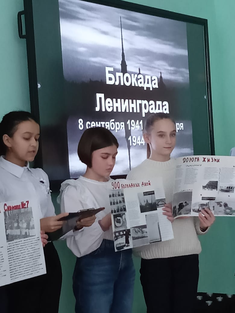 27 января в рамках недели русского языка, литературы и истории прошло мероприятие, посвящённое дню снятия блокады Ленинграда. В мероприятии приняли участие учащиеся 7-ых классов. Ведущие мероприятия и учитель русского языка и литературы Шакирова Айгуль Хамитовна рассказали присутствующим о книге Агнии Барто «Найти человека». Был просмотрен буктрейлер о данной книге, в котором рассказывалось о том, как писательница, работая на радио, вела поисковую деятельность тех людей, которые потерялись во время блокады Ленинграда. Были зачитаны отрывки из данной книги.Затем учащиеся 7-ых классов познакомили всех со своими школьными проектами, посвящёнными символам блокады Ленинграда: дороге жизни, дневнику Тани Савичевой и т.д. Учитель истории и обществознания Сунгатуллина Лилия Вакифовна рассказала о том, как долго длилась блокада Ленинграда, о том тяжёлом положении, в котором оказались люди, о их героизме. Ученица 7 Б класса выступила со стихотворением Э. Асадова «Чулочки». В конце мероприятия ребятам показали норму хлеба, который выдавался в день на 1 человека, рассказали, из чего его пекли. Под звук метронома были зажжены свечи в память о погибших в блокаду и проведена минута молчания.27 гыйнвар көнне рус теле, әдәбияты һәм тарих атналыгы кысаларында Ленинград блокадасын өзүгә багышланган чара узды. Чарада 7 нче сыйныф укучылары катнашты. Чараны алып баручылар һәм рус теле һәм әдәбияты укытучысы Шакирова Айгөл Хәмит кызы Агни Бартоның "кеше табарга" китабы турында сөйләделәр. Әлеге китап турында буктрейлер каралды, анда язучының радиода эшләве, Ленинград блокадасында калган кешеләрнең эзләү эшчәнлеге алып баруы турында сөйләнде. Әлеге китаптан өзекләр укылды.Тарих һәм җәмгыять белеме укытучысы Сөнгатуллина Лилия Вакыйф кызы Ленинград блокадасының ничек озак дәвам итүе, кешеләр булган авыр хәлләре, аларның батырлыгы турында сөйләде. 7 Б сыйныф укучысы Э.Асадованың «Чулочки»шигыре белән чыгыш ясады. Чара ахырында балаларга бер көнгә 1 кешегә бирелгән икмәк нормасын күрсәттеләр, аның нәрсә ашаганын сөйләделәр. Метроном тавышы астында блокадада һәлак булганнар истәлегенә шәмнәр кабынды һәм бер минут тынлык белән уздырылды.