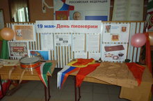 Мәктәбебездә пионерия көненә багышланган күргәзмә эшләнде. 19 нчы май көнне тәнәфес вакытында пионер җырлары яңгырап торды.