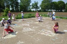 Бүген лагерьда балалар мәктәп каршындагы асфальтка рәсемнәр ясадылар.Рәсемнәрнең темасы: Габдулла Тукайның 130 еллыгына багышланган , без тынычлык яклы, минем гаиләм .Һәр отряд та бик матур итеп рәсемнәр ясадылар. Соңыннан спорт залында өч отрядка бүленеп эстафета үткәрдек.