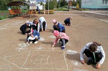 Сегодня учащиеся начальных классов сделали рисунки на асфальте под названием “Светлый город, район, деревня"