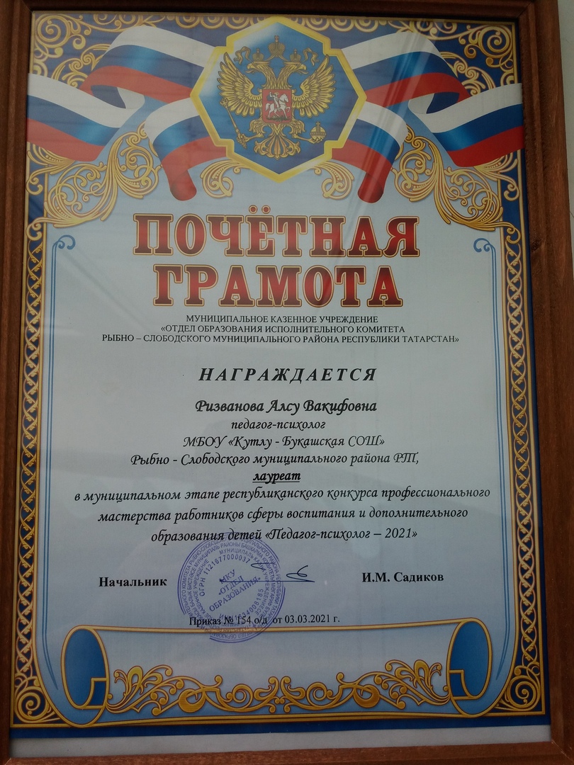 2021 елның 26 февралендә «Педагог-психолог - 2021» республика һөнәри осталык конкурсының дистанцион муниципаль этабы узды. Котлы- Бөкәш урта мәктәбе педагог-психологы Ризванова А.В. әлеге конкурста лауреат булды.