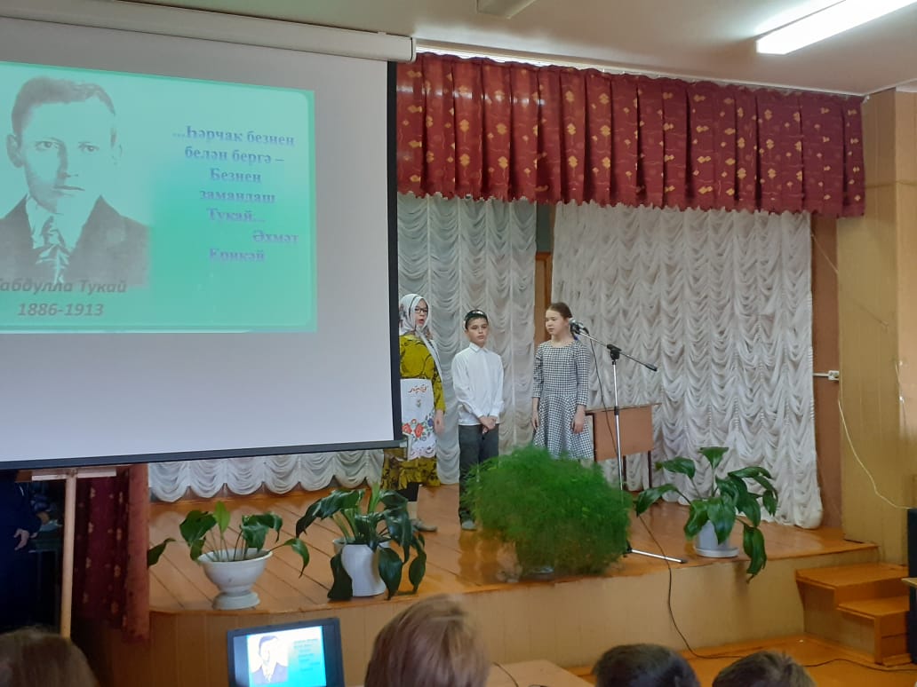 26 апреля-135-летний юбилей великого поэта Габдуллы Тукая. В связи с этим состоялось литературно-музыкальное мероприятие " Йөрәкләрдә Тукай эзләре, күңелләрдә Тукай сүзләре ", посвященное жизни и творчеству поэта. Учащиеся 5-6 классов инсценировали произведения писателя, рассказали стихотворения , познакомили с воспоминаниями современников.