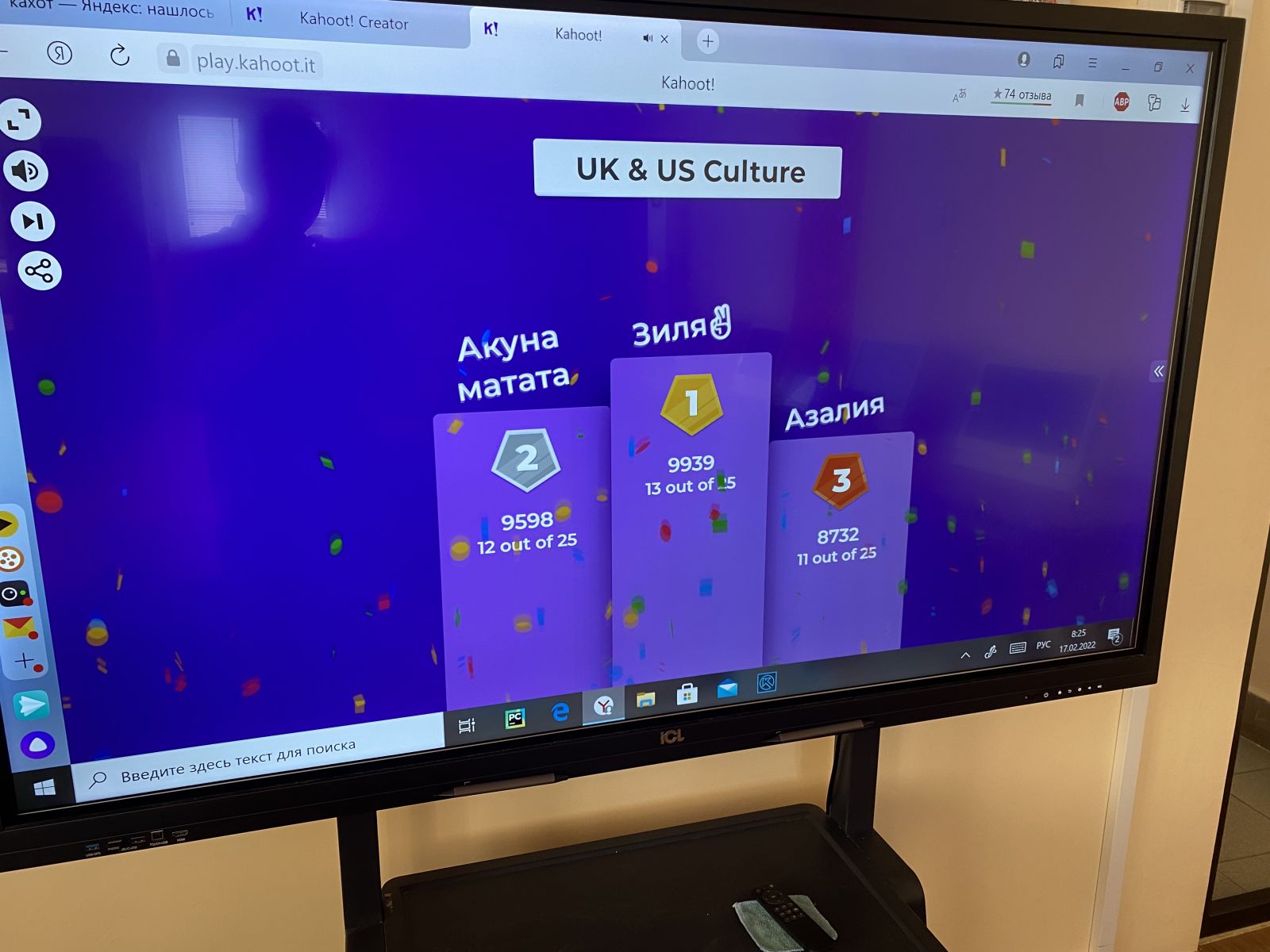 Опубликовано: 16.02.202215 января в рамках недели английского языка с учениками провели викторину на платформе Kahoot!