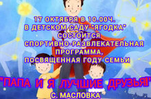 17 октябрь көнне10.00 сэгатьтә Масловка "Ягодка" балалар бакчасында "Әти һәм мин - яхшы дуслар" дигән спорт уен чарасы үткәреләчәк. Тәрбияләнүчеләрнең әтиләрен көтеп калабыз!