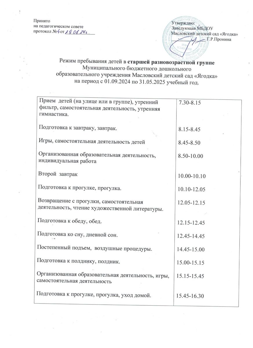 Режим дня детей в старшей разновозрастной группы на 2024-2025 учебный год.