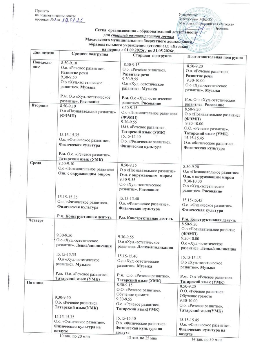 Расписание ООД для старшей разновозрастной группы на 2025-2026 учебный год