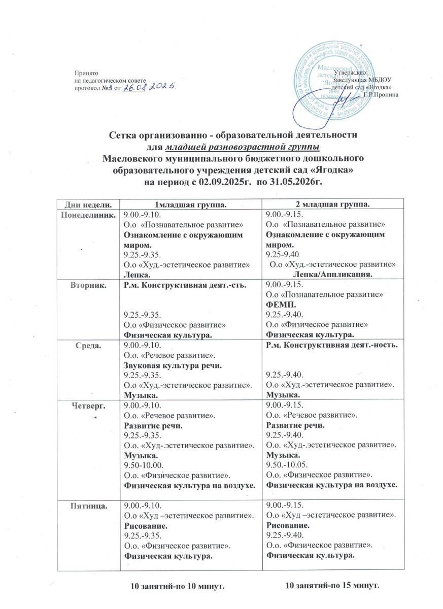 Расписание ООД для младшей разновозрастной группы на 2025-2026 учебный год