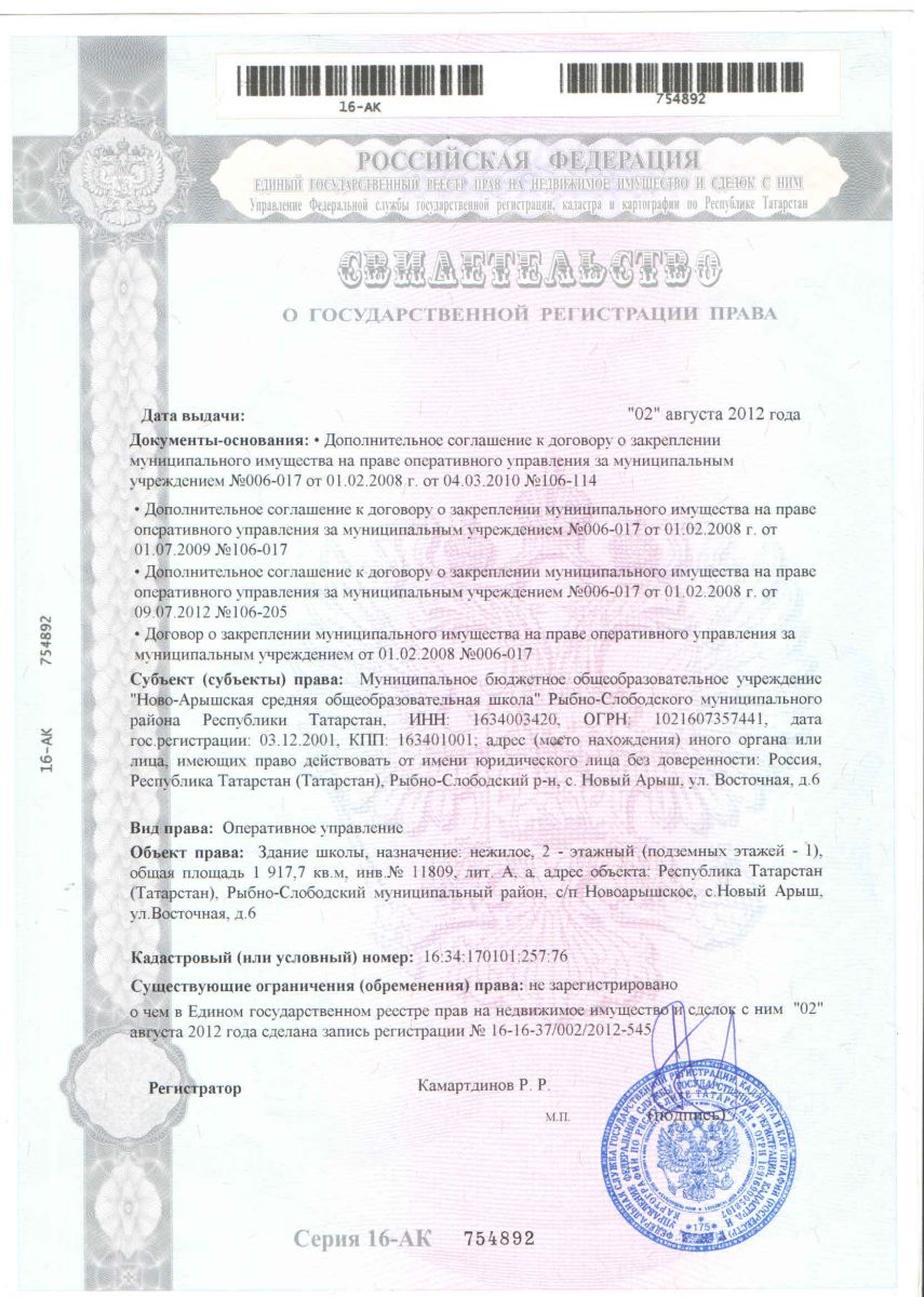 Адрес: 422656, Республика Татарстан, Рыбно - Слободский район, с. Новый Арыш, ул. Восточная, д. 6/Татарстан Республикасы, Балык бистәсе муниципаль районы, Яңа Арыш авылы, Көнчыгыш урамы,6 нчы йорт