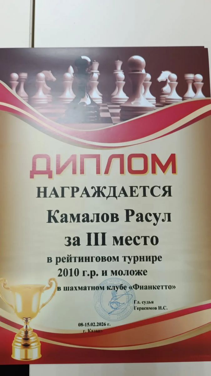 Обучающиеся Центра детского творчества, под руководством Пузырькова И.Р., успешно выступили в шахматном турнире, прошедшем в городе Казани. Хайрутдинов Карим и Камалов Расул заняли соответственно 2 и 3 места в возрастной группе 2010-2015 года рождения. Победители и призеры были награждены дипломами и ценными подарками.