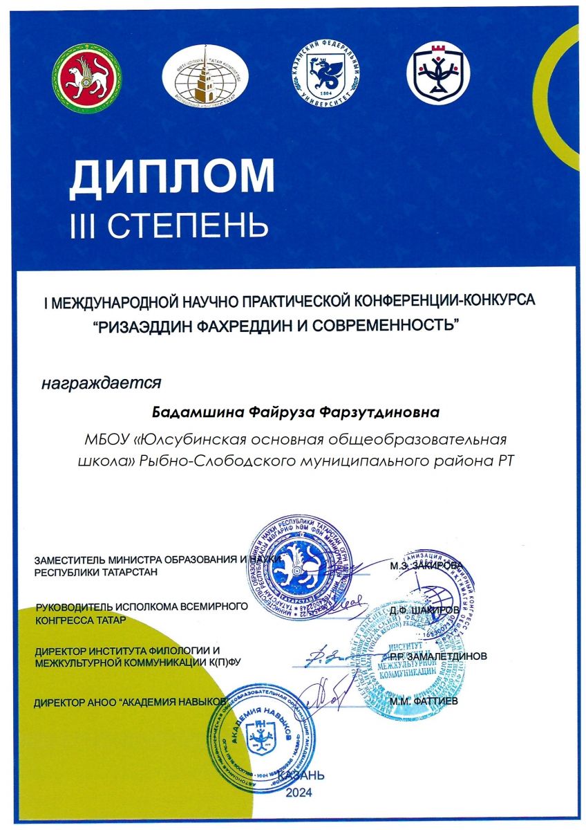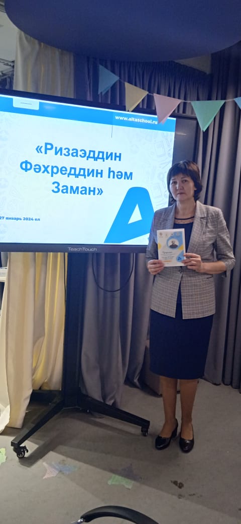 Педагог дополнительного образования, краевед Бадамшина Файруза Фарзутдиновна приняла участие в Международной научно-практической конференции «Ризаэддин Фахреддин и современность», посвященной 165-летию со дня рождения великого педагога, просветителя, ученого, общественного деятеля Р.Фахреддина. Конференция проходила в г.Казани,в Автономной некоммерческой организации «Академия навыков».Исследовательская работа Файрузы Фарзутдиновны удостоена Диплома III cтепени
